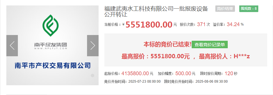 近日,福建武夷水工科技有限公司報(bào)廢設(shè)備轉(zhuǎn)讓項(xiàng)目在南平市產(chǎn)權(quán)交易有限公司高溢價(jià)成交,市場(chǎng)化運(yùn)作助推資產(chǎn)增值超34%。該項(xiàng)目掛牌價(jià)413.58萬(wàn)元,經(jīng)過(guò)多輪激烈競(jìng)價(jià),最終以555.18萬(wàn)元成交,實(shí)現(xiàn)增值141.6萬(wàn)元,溢價(jià)率達(dá)34.24%,實(shí)現(xiàn)閑置資產(chǎn)高效盤(pán)活與顯著增值,彰顯產(chǎn)權(quán)交易平臺(tái)資源配置效能。